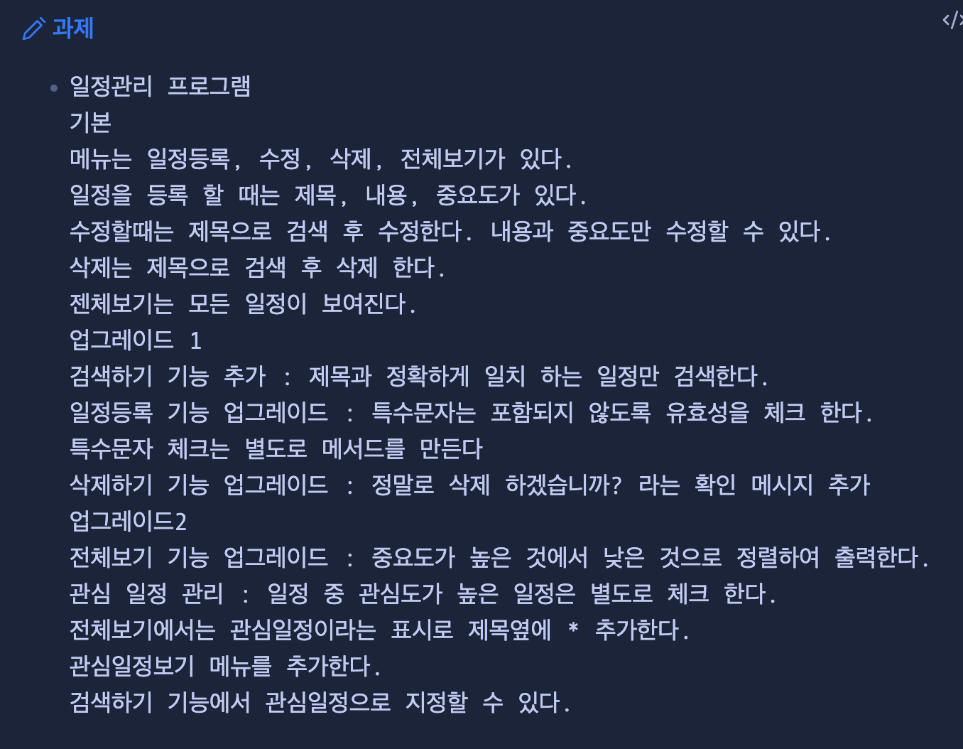 System.out.println("일정 내용을 입력 해 주세요. 일정 내용은 특수 문자 없이 영어 및 한글만 작성 가능합니다 ");