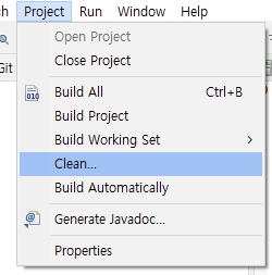 2. 메뉴바에 Project -> Clean -> 해당 프로젝트만 선택 후 Clean