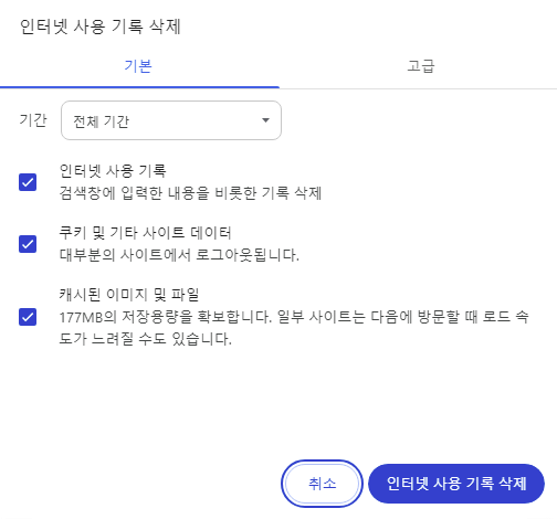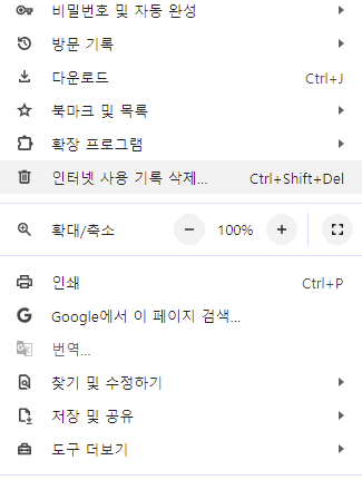 1. 크롬 설정에 인터넷 사용 기록 삭제 진행