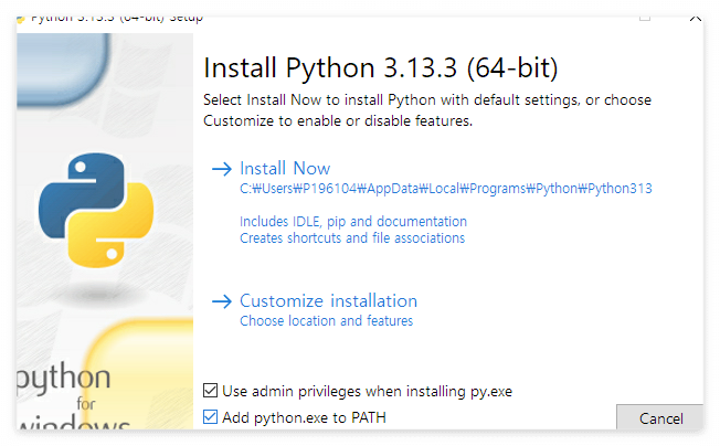 혹시라도 체크를 하지 않았을 경우 python PATH 경로 잡는 방법을 별도 검색 해 잡아야 한다.