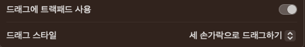 트랙패드 옵션 > 드래그에 트랙패드 사용 활성화 / 드래그 스타일 > 세 손가락으로 드래그하기