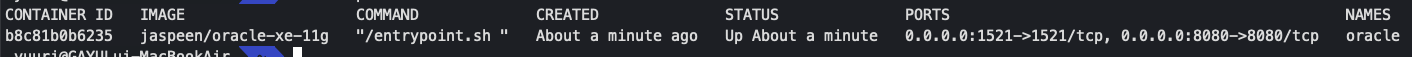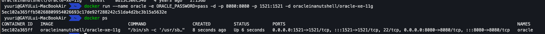 docker run --platform linux/amd64 --name oracle_test -e ORACLE_PASSWORD=pass -d -p 9000:8080 -p 1521:1521 -d jaspeen/oracle-xe-11g