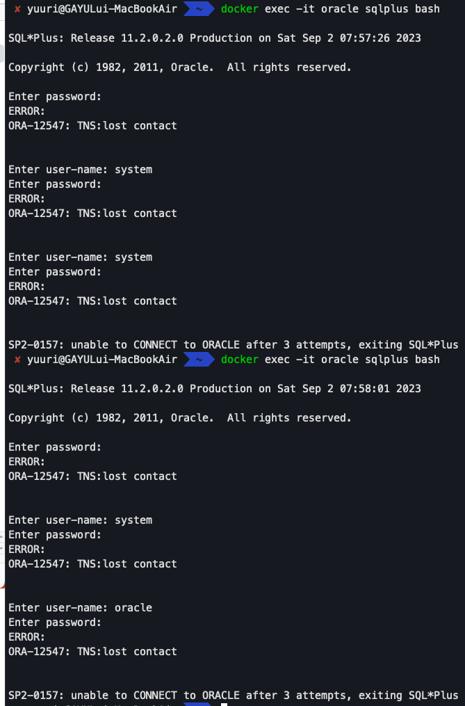 | Macbook M1 pro 16 개발 환경구성 - docker와 oracle listener 오류 / 1521 port 비활성화 오류 / 상태: 실패 -테스트 실패: IO 오류: The Network Adapter could not establish the connection (CONNECTION_ID=/DJQ/0BASUOpP2bmPQF+LQ==) (1) | 2024.01.28 |