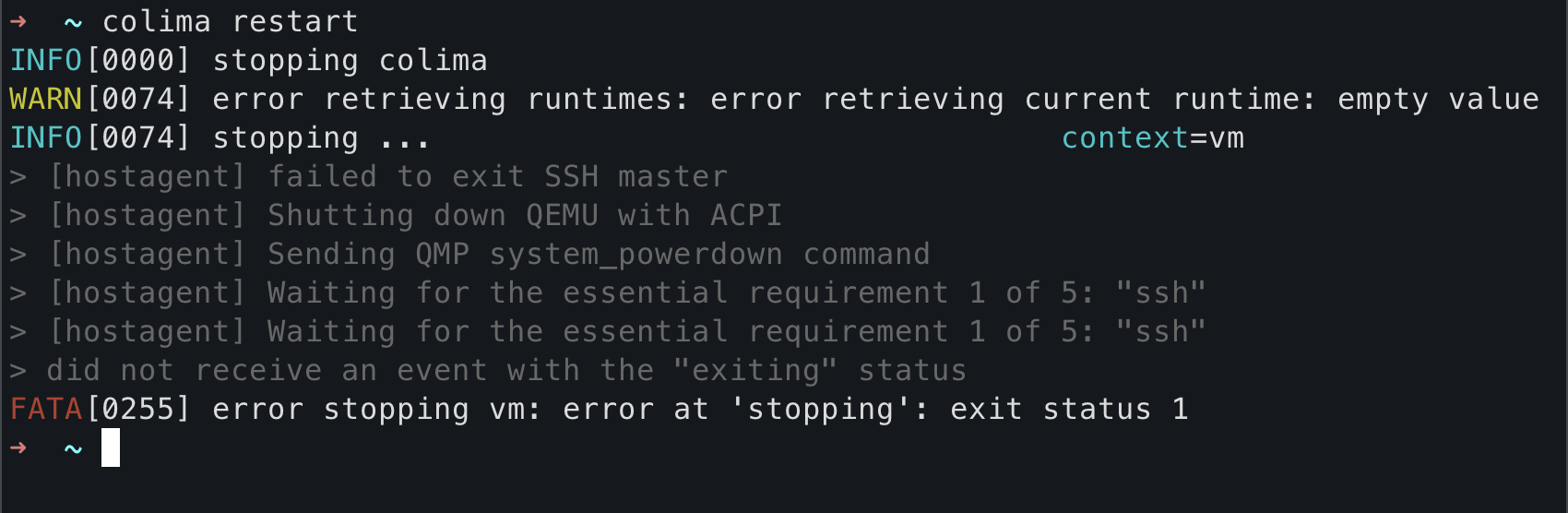 Colima not starting "FATA[0002] error starting vm: error at 'starting': exit status 1" · Issue #786 · abiosoft/colima