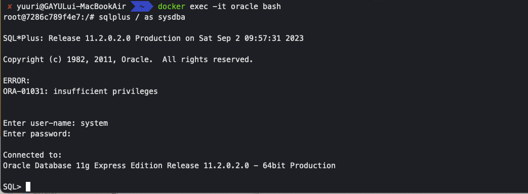 docker exec -it [컨테이너명] sqlplus