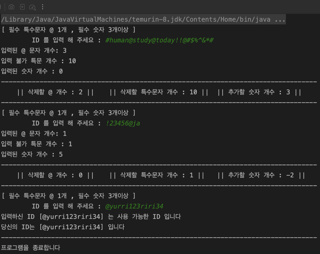 System.out.print("[ 필수 특수문자 @ 1개 , 필수 숫자 3개이상 ] \n\t\tID 를 입력 해 주세요 : ");